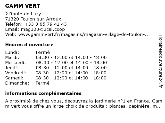 2 GAMM VERT (Distance: 12,90 km) 1 Lieu-dit Les Vavres, 71130 Gueugnon aliments pour animaux, animalerie, animaux de basse-cour, arbre à chat, arbres fruitiers et arbustes de pépinière, articles de jardin, barbecues et planchas, composteur, croquettes pour chiens, désherbage, engrais bio, gamm, graine, litière pour chats, mobilier de jardin, plantes, poisson rouge, produits du terroir, rosier, récupérateur d'eau de pluie, salons de jardin et parasols, vert 3 Gamm vert (Distance: 19,30 km) Place de la Gare, 71190 Étang-sur-Arroux animalerie, gamm, jardin, jardinerie, mobilier de jardin, plantes, pépinière, vert 4 GAMM VERT VILLAGE Toulon sur Arroux (Distance: 0,00 km) 2 Route de Luzy, 71320 Toulon-sur-Arroux arroux, gamm, sur, toulon, vert, village 6 |