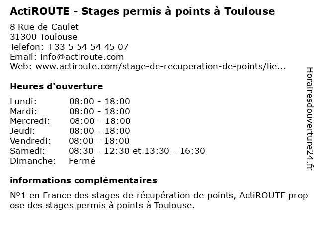 1 ActiROUTE - Stages permis à points à Toulouse (Distance: 7,86 km) 76 Rue de la Colombette, 31000 Toulouse 4 points, actiroute, agréés, experts en sécurité routière, formation, n°1 en france, permis, permis de conduire, permis à points, points, psychologues, sensibilisation à la sécurité routière, stage de sensibilisation à la sécurité routière, stage permis probatoire, stage permis à points, stages, stages de récupération de points, toulouse 2 ActiROUTE - Stages permis à points à Toulouse (Distance: 12,19 km) 30 Rue des Cosmonautes, 31400 Toulouse 4 points, actiroute, agréés, experts en sécurité routière, formation, n°1 en france, permis, permis de conduire, permis à points, points, psychologues, sensibilisation à la sécurité routière, stage de sensibilisation à la sécurité routière, stage permis probatoire, stage permis à points, stages, stages de récupération de points, toulouse 3 ActiROUTE - Colomiers (Distance: 4,03 km) 14b Chemin de la Chasse, 31770 Colomiers 4 points, actiroute, agréés, colomiers, experts en sécurité routière, formation, n°1 en france, permis de conduire, permis à points, psychologues, sensibilisation à la sécurité routière, stage de sensibilisation à la sécurité routière, stage permis probatoire, stage permis à points, stages, stages de récupération de points 5 Permis Malin (Distance: 5,28 km) 4 Avenue Grande Bretagne, 31000 Toulouse agence, auto école, examens, malin, permis 6 Tous Les Gouts Sont Permis (Distance: 7,75 km) 1 Place Antonin Froidure, 31200 Toulouse boulangeries, détail, gouts, permis, tous |