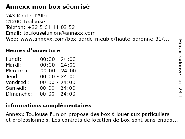 1 Annexx mon box sécurisé (Distance: 9,47 km) 70 Rue Jacques Babinet, 31100 Toulouse annexx, box, mon, sécurisé 2 Annexx mon box sécurisé (Distance: 10,18 km) 4 Rue de Caulet, 31300 Toulouse annexx, box, mon, sécurisé 3 Annexx mon box sécurisé (Distance: 12,34 km) 2 Avenue des Crêtes, 31520 Ramonville-Saint-Agne annexx, box, mon, sécurisé 4 Annexx Selfstorage (Distance: 0,01 km) 243 Route d'Albi, 31200 Toulouse accès, annexx, box, location, self-stokage, selfstorage, stockage 5 Leader Box Toulouse Est (Distance: 1,26 km) 54 Rue André Vasseur, 31200 Toulouse box, est, leader, toulouse 6 Blue Box (Distance: 2,43 km) 3 avenue d’Hermes ZI Montredon, 31240 L'Union blue, box, femmes, magasin, union, vêtements |
