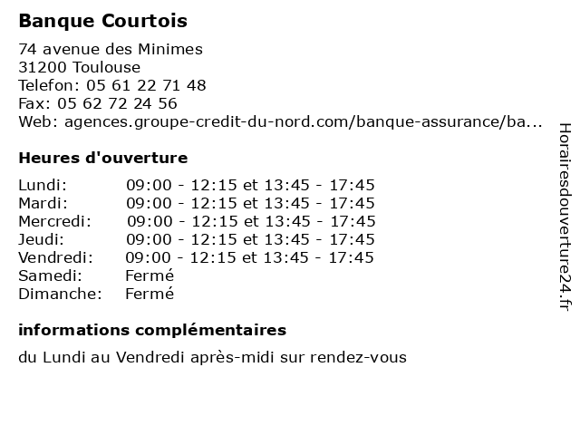 1 Banque Courtois (Distance: 1,85 km) 195 faubourg Bonnefoy, 31500 Toulouse agence, bancaire, banque, courtois 2 Banque Courtois (Distance: 2,42 km) 9 place Saint-Etienne, 31000 Toulouse agence, bancaire, banque, courtois 3 Banque Courtois (Distance: 4,25 km) 51 bis route de Fronton, 31140 Aucamville agence, bancaire, banque, courtois 4 Banque Courtois (Distance: 4,97 km) 7 avenue de Toulouse, 31130 Balma agence, bancaire, banque, courtois 5 Banque Courtois (Distance: 5,10 km) 1 allée des Nymphéas, 31240 L'Union agence, bancaire, banque, courtois 6 Banque Courtois (Distance: 5,23 km) - place de la Révolution Française, 31700 Blagnac agence, bancaire, banque, courtois |
