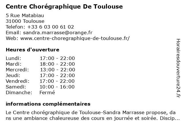 Le Centre chorégraphique de Toulouse-Sandra Marrasse propose, dans une ambiance chaleureuse des cours en journée et soirée. Disciplines enseignées : danse classique, contemporaine, jazz , barre...