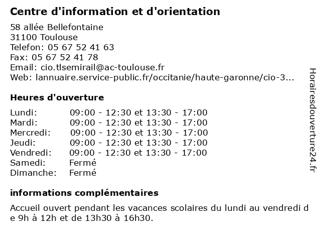 1 Centre d'information et d'orientation (Distance: 5,51 km) n/a Rue de la Cité-Administrative, 31003 Toulouse administration, assoc, associations, centre, d'information, d'orientation, des, et, greffe, information, locale, mission, services, services publics 2 Centre d'information et d'orientation (Distance: 6,08 km) 68 boulevard de Strasbourg, 31000 Toulouse centre, choix d'orientation scolaire, d'information, d'orientation, et, et professionnelle. 3 Centre d'information et d'orientation (Distance: 7,45 km) 32 rue Mathaly, 31200 Toulouse administration, assoc, associations, centre, cio, d'information, d'orientation, des, et, greffe, information, locale, mission, nord, services, services publics, toulouse 4 Maison de l'Orientation de Toulouse (Distance: 0,05 km) 57 Allée de Bellefontaine, 31100 Toulouse de, l'orientation, maison, toulouse 5 Point d'information local dédié aux personnes âgées (Distance: 0,39 km) 9 rue du Doyen-Lefebvre, 31100 Toulouse administration, aux, d'information, dédié, local, organismes, personnes, point, publics, services, toulouse, âgées 6 Point Information Jeunesse (Distance: 0,93 km) 6 chemin Edgar-Varèse, 31100 Toulouse administration, assoc, bressuire, bureau, information, jeunesse, le, mirail, point, services, services publics, toulouse |