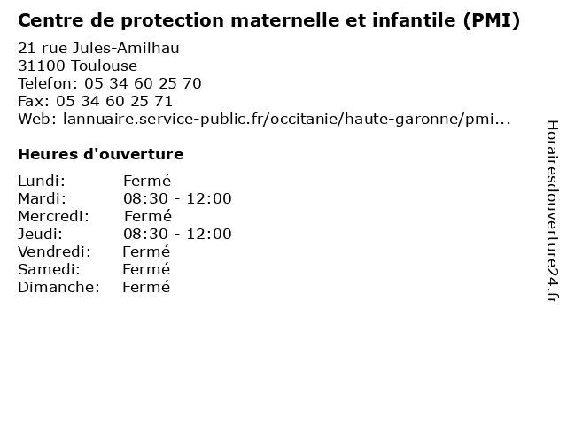 | 1 Centre de protection maternelle et infantile (PMI) (Distance: 0,49 km) 36 rue du Lot, 31100 Toulouse administration, assoc, associations, aux, centre, d'information, de, des, dédié, et, greffe, infantile, information, local, locale, maternelle, mission, personnes, pmi, protection 2 Centre de protection maternelle et infantile (PMI) (Distance: 2,23 km) 9 rue du Doyen-Lefèbvre, 31100 Toulouse administration, assoc, associations, aux, centre, d'information, de, des, dédié, et, greffe, infantile, information, local, locale, maternelle, mission, personnes, pmi, protection 3 Centre de protection maternelle et infantile (PMI) (Distance: 3,12 km) 39 rue Camille-Desmoulins, 31400 Toulouse administration, assoc, associations, aux, centre, d'information, de, des, dédié, et, greffe, infantile, information, local, locale, maternelle, mission, personnes, pmi, protection 4 Centre de protection maternelle et infantile (PMI) (Distance: 4,72 km) 33 rue Joseph-Jacquard, 31200 Toulouse administration, assoc, associations, aux, centre, d'information, de, des, dédié, et, greffe, infantile, information, local, locale, maternelle, mission, personnes, pmi, protection 5 Centre de protection maternelle et infantile (PMI) (Distance: 7,07 km) 4 allée du Plantaurel, 31770 Colomiers administration, assoc, associations, aux, centre, d'information, de, des, dédié, et, greffe, infantile, information, local, locale, maternelle, mission, personnes, pmi, protection 6 Centre de protection maternelle et infantile (PMI) (Distance: 8,66 km) 4 Boulevard Alain Savary, 31700 Blagnac administration, assoc, associations, aux, centre, d'information, de, des, dédié, et, greffe, infantile, information, local, locale, maternelle, mission, personnes, pmi, protection |