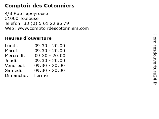1 Comptoir Des Cotonniers (Distance: 0,22 km) 17 Rue Des Arts, 31000 Toulouse accessoires, chaussures, comptoir, cotonniers, des, mode femme 2 Comptoir des Cotonniers (Distance: 0,49 km) 59 Rue des Filatiers, 31000 Toulouse accessoires, chaussure, comptoir, cotonniers, des, femme, mode, vêtements 3 Comptoir Des Cotonniers (Distance: 7,74 km) 700 La Pyrénéenne, 31670 Labège beaute, bijouterie, comptoir, cotonniers, des, enfants, mode femme, mode homme, restaurant, service, sport 4 Comptoir National de l'Or Toulouse (Distance: 0,11 km) 6 Rue du Poids de l'Huile, 31000 Toulouse comptoir, de, l'or, national, toulouse 5 Le Comptoir des Nageurs (Distance: 0,16 km) 4 Rue Paul Mériel, 31000 Toulouse comptoir, des, le, nageurs 6 Le Comptoir de Mathilde (Distance: 0,23 km) 5 Rue Lafayette, 31000 Toulouse cadeaux, chocolaterie, comptoir, de, le, mathilde, épicerie |