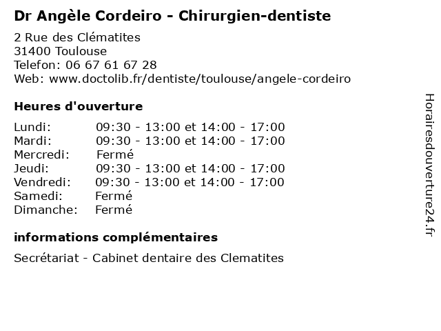 1 Dr Angele Cordeiro - Chirurgien-dentiste (Distance: 8,09 km) 164 Chemin de Nicol, 31200 Toulouse angele, chirurgien, cordeiro, dentaire, dentiste, dr, implantologie, parodontologie 2 Dr Robic Marie-Angèle - Hépato-gastro-entérologie (Distance: 9,65 km) - Place du Docteur Baylac, 31059 Toulouse angèle, docteur, dr, entérologie, gastro, hépato, hôpital, marie, médecine, robic 3 Maître Angèle Mazarin - Avocate (Distance: 11,40 km) 3 Rue Lavoisier, 31700 Blagnac angèle, angèle mazarin, avocat, avocate, droit, juridictionnelle, mazarin, maître, négociation 4 Dr Julien Cordeiro - Chirurgien-dentiste (Distance: 15,48 km) 7 Avenue de l'Hers, 31450 Baziège chirurgien, cordeiro, dentaire, dentiste, dr, implantologie, julien, parodontologie 5 Dr Angele Benoit - Chirurgien-dentiste (Distance: 5,94 km) 16 Rue Maurice Fonvieille, 31000 Toulouse angele, benoit, chirurgien, consultation, dentiste, docteur, dr, med, secrétariat 6 Dr. Robic Marie Angele - Gastro-entérologie et hépatologie [Purpan] (Distance: 6,43 km) 2 Rue Viguerie, 31300 Toulouse [purpan], angele, docteur, dr., entérologie, et, gastro, hépatologie, marie, medecins, robic, sante |