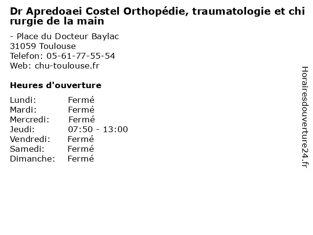1 Dr Cornet Marie-Pierre - Orthopédie dento-faciale adultes (Distance: 0,00 km) - Place du Docteur Baylac, 31059 Toulouse adultes, cornet, dento, docteur, dr, faciale, hôpital, marie, médecine, orthopédie, pierre 2 Dr De Sereville Frédéric- Orthopédie dento-faciale (Distance: 0,00 km) - Place du Docteur Baylac, 31059 Toulouse de, dento, docteur, dr, faciale, frédéric, hôpital, médecine, orthopédie, sereville 3 Dr Rotenberg Maxime - Orthopédie dento-faciale (Distance: 0,00 km) - Place du Docteur Baylac, 31059 Toulouse dento, docteur, dr, faciale, hôpital, maxime, médecine, orthopédie, rotenberg 4 Pr Sales De Gauzy Jérôme - Orthopédie - consultations (Distance: 0,42 km) 330 avenue de Grande Bretagne, 31059 Toulouse consultations, de, docteur, gauzy, hôpital, jérôme, médecine, orthopédie, pr, sales 5 Pr Sales De Gauzy Jérôme - Orthopédie (Distance: 0,42 km) 330 avenue de Grande Bretagne, 31059 Toulouse de, docteur, gauzy, hôpital, jérôme, médecine, orthopédie, pr, sales 6 Pr Accadbled Franck - Orthopédie (Distance: 0,42 km) 330 avenue de Grande Bretagne, 31059 Toulouse accadbled, docteur, franck, hôpital, médecine, orthopédie, pr |