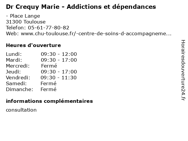 1 Pr Schmitt Laurent - Psychiatrie générale, psychologie médicale, addictions et dépendances (Distance: 2,85 km) 330 avenue de Grande Bretagne, 31059 Toulouse addictions, docteur, dépendances, et, générale, hôpital, laurent, médecine, médicale, pr, psychiatrie, psychologie, schmitt 2 Pr Schmitt Laurent - Psychiatrie générale, psychologie médicale, addictions et dépendances - consultations privées (Distance: 2,85 km) 330 avenue de Grande Bretagne, 31059 Toulouse addictions, consultations, docteur, dépendances, et, générale, hôpital, laurent, médecine, médicale, pr, privées, psychiatrie, psychologie, schmitt 3 Dr Viraben Roland - Dermatologie générale (Distance: 0,00 km) - Place Lange, 31059 Toulouse dermatologie, docteur, dr, générale, hôpital, médecine, roland, viraben 4 Dr Prevoteau Du Clary François - Prise en charge du VIH (Distance: 0,00 km) - Place Lange, 31059 Toulouse charge, clary, docteur, dr, du, en, françois, hôpital, médecine, prevoteau, prise, vih 5 Dr Tardy Marie - Psychiatrie et psychothérapies (Distance: 0,06 km) - Place Lange, 31059 Toulouse docteur, dr, et, hôpital, marie, médecine, psychiatrie, psychothérapies, tardy 6 Dr Grimoud Anne-Marie - Odontologie (Distance: 0,06 km) - Place Lange, 31059 Toulouse anne, docteur, dr, grimoud, hôpital, marie, médecine, odontologie |