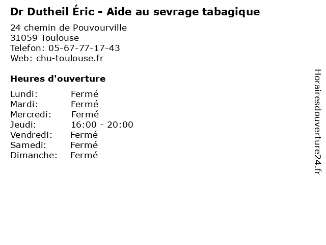 1 Dr Garrigue Éric - Médecine du sport (Distance: 0,00 km) 24 chemin de Pouvourville, 31059 Toulouse docteur, dr, du, garrigue, hôpital, médecine, sport, éric 2 Dr Tribet Emmanuelle - Aide au sevrage tabagique (Distance: 0,00 km) 24 chemin de Pouvourville, 31059 Toulouse aide, au, docteur, dr, emmanuelle, hôpital, médecine, sevrage, tabagique, tribet 3 Dr Fayas Serge - Aide au sevrage tabagique (Distance: 0,00 km) 24 chemin de Pouvourville, 31059 Toulouse aide, au, docteur, dr, fayas, hôpital, médecine, serge, sevrage, tabagique 4 Dr Galley Michèle - Aide au sevrage tabagique (Distance: 0,00 km) 24 chemin de Pouvourville, 31059 Toulouse aide, au, docteur, dr, galley, hôpital, michèle, médecine, sevrage, tabagique 5 Pr Huyghe Éric Urologie et andrologie (Distance: 0,64 km) 1 avenue du Professeur Jean Poulhès, 31059 Toulouse andrologie, docteur, et, huyghe, hôpital, médecine, pr, urologie, éric 6 Dr. Dutheil Éric - Pneumologie (Distance: 5,27 km) 2 Rue Viguerie, 31300 Toulouse docteur, dr., dutheil, medecins, pneumologie, sante, éric |
