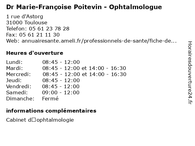 1 Dr Jérôme Poitevin - Ophtalmologiste (Distance: 0,00 km) 1 rue d'Astorg, 31000 Toulouse dr, jérôme, ophtalmologie, ophtalmologiste, ophtalmologistes, ophtalmologue, poitevin, vision 3 Blanc Brude Françoise (Distance: 0,34 km) 19 Allées Forain-François Verdier, 31000 Toulouse blanc, brude, françoise 4 Dr Françoise Saint-Martin - Endocrinologue (Distance: 0,47 km) 32 Rue d'Alsace Lorraine, 31000 Toulouse dr, endo, endocrinologue, françoise, martin, saint, sante, soins 5 Dr Céline Michaud - Ophtalmologue (Distance: 0,50 km) 6 Boulevard de Strasbourg, 31000 Toulouse celine, consultation, céline, docteur, dr, michaud, médicale, ophtalmologue, rendez, santé, secrétaire, sur, vous 6 Maître Françoise Monestier - Avocate (Distance: 0,51 km) 6 rue Vélane, 31000 Toulouse avocat, avocate, droit, françoise, françoise monestier, juridictionnelle, maître, monestier, négociation |