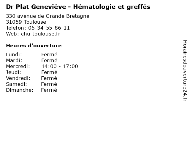 1 Dr Castex Marie-Pierre - Hématologie (Distance: 0,00 km) 330 avenue de Grande Bretagne, 31059 Toulouse castex, docteur, dr, hématologie, hôpital, marie, médecine, pierre 2 Dr. Huguet Françoise - Hématologie (service) [IUCT-Oncopole] (Distance: 3,07 km) 2 Rue Viguerie, 31300 Toulouse [iuct, docteur, dr., françoise, huguet, hématologie, medecins, oncopole], sante, service 3 Dr. Huynh Anne - Hématologie (service) [IUCT-Oncopole] (Distance: 3,07 km) 2 Rue Viguerie, 31300 Toulouse [iuct, anne, docteur, dr., huynh, hématologie, medecins, oncopole], sante, service 4 Dr. Roussel Murielle - Hématologie (service) [IUCT-Oncopole] (Distance: 3,07 km) 2 Rue Viguerie, 31300 Toulouse [iuct, docteur, dr., hématologie, medecins, murielle, oncopole], roussel, sante, service 5 Dr. Ysebaert Loïc - Hématologie (service) [IUCT-Oncopole] (Distance: 3,07 km) 2 Rue Viguerie, 31300 Toulouse [iuct, docteur, dr., hématologie, loïc, medecins, oncopole], sante, service, ysebaert 6 Dr. Borel Cécile - Hématologie (service) [IUCT-Oncopole] (Distance: 3,07 km) 2 Rue Viguerie, 31300 Toulouse [iuct, borel, cécile, docteur, dr., hématologie, medecins, oncopole], sante, service |