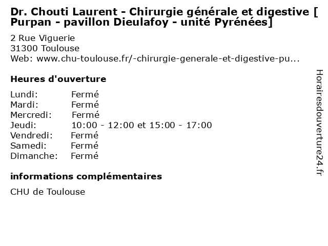 Termes de recherche pour Dr. Chouti Laurent - Chirurgie générale et digestive [Purpan - pavillon Dieulafoy - unité Pyrénées]:et, laurent, générale, santé, unité, pavillon, chirurgie, docteur, dr., médecins, dieulafoy, digestive, [purpan, pyrénées], chouti |