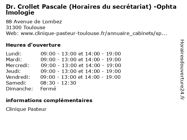 Termes de recherche pour Dr. Crollet Pascale (Horaires du secrétariat) -Ophtalmologie:du, horaires, santé, pascale, secretariat, docteur, dr., médecins, ophtalmologie, crollet |