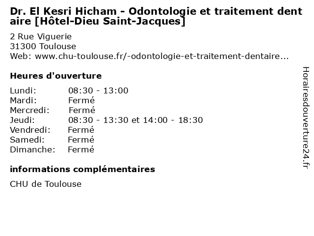 Termes de recherche pour Dr. El Kesri Hicham - Odontologie et traitement dentaire [Hôtel-Dieu Saint-Jacques]:dieu, et, saint, el, dentaire, santé, traitement, docteur, dr., médecins, odontologie, [hôtel, jacques], hicham, kesri |
