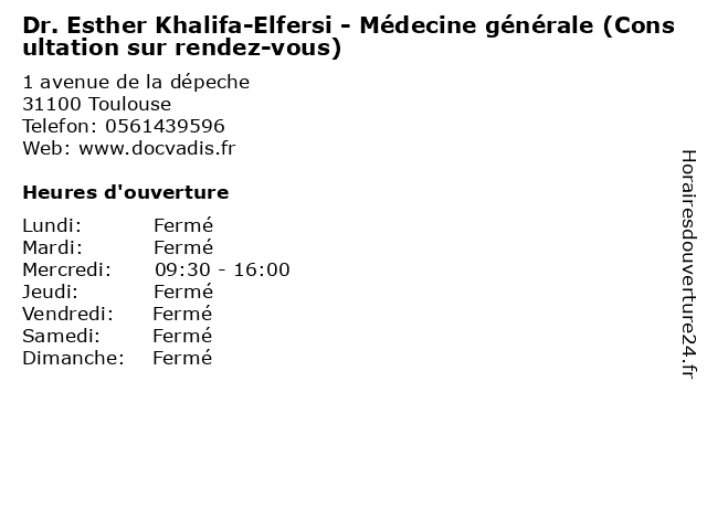Termes de recherche pour Dr. Esther Khalifa-Elfersi - Médecine générale (Consultation sur rendez-vous):sur, générale, vous, medecine, santé, rendez, docteur, dr., consultation, esther, khalifa, elfersi |