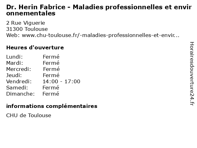 1 Dr. Herin Fabrice - Maladies professionnelles et environnementales (Distance: 0,00 km) 2 Rue Viguerie, 31300 Toulouse docteur, dr., environnementales, et, fabrice, herin, maladies, medecins, professionnelles, sante 2 Dr. Esquirol Yolande - Maladies professionnelles et environnementales (Distance: 0,00 km) 2 Rue Viguerie, 31300 Toulouse docteur, dr., environnementales, esquirol, et, maladies, medecins, professionnelles, sante, yolande 3 Dr. Lombard Laure - Maladies professionnelles et environnementales (Distance: 0,00 km) 2 Rue Viguerie, 31300 Toulouse docteur, dr., environnementales, et, laure, lombard, maladies, medecins, professionnelles, sante 4 Dr. Mailhol Claire- Maladies professionnelles et environnementales (Distance: 0,00 km) 2 Rue Viguerie, 31300 Toulouse claire, docteur, dr., environnementales, et, mailhol, maladies, medecins, professionnelles, sante 5 Dr. Pujazon Marie-Christine - Maladies professionnelles et environnementales (Distance: 0,00 km) 2 Rue Viguerie, 31300 Toulouse christine, docteur, dr., environnementales, et, maladies, marie, medecins, professionnelles, pujazon, sante 6 Dr. Rouane Jean-René - Maladies professionnelles et environnementales (Distance: 0,00 km) 2 Rue Viguerie, 31300 Toulouse docteur, dr., environnementales, et, jean, maladies, medecins, professionnelles, rené, rouane, sante |