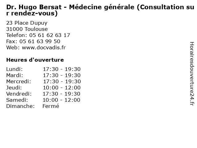 1 Dr. Hugo Bersat - Médecine générale (Consultation libre) (Distance: 0,00 km) 23 Place Dupuy, 31000 Toulouse bersat, consultation, docteur, dr., générale, hugo, libre, medecins, médecine, santé 2 Atelier NA - Costume sur Mesure (Distance: 0,40 km) 46 Rue de Metz, 31000 Toulouse atelier, cabine 3d, chemise sur mesure, costume, costume 3 pièces, costume de mariage, costume sur mesure, manteau sur mesure, mesure, na, smoking sur mesure, sur, sur mesure, toulouse, vêtements pour hommes 3 Revolucion Coiffure sur Mesure (Distance: 0,62 km) 16 rue Maury, 31000 Toulouse beauté, cheveux, coiffeur, coiffure, femme, mesure, mâle, revolucion, salon, sur 4 Ma Biche sur Le Toit (Distance: 0,69 km) 4-8 Rue du Lieutenant Colonel Pélissier, 31000 Toulouse bar, biche, bistro, bistrot, brasserie, café, le, ma, restaurant, restauration, sur, toit 5 Agence départementale d'information sur le logement (ADIL) (Distance: 0,73 km) 4 rue Furgole, 31000 Toulouse adil, administration, agence, assoc, d'information, départementale, le, logement, services, services publics, sur 6 Dr. Guillaume Casse - Ophtalmologie (Consultation sur rendez-vous) (Distance: 0,87 km) 6 Bd de Strasbourg, 31000 Toulouse casse, consultation, docteur, dr., guillaume, medecins, ophtalmologie, rendez, santé, sur, vous |