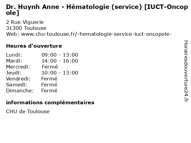 1 Dr. Huguet Françoise - Hématologie (service) [IUCT-Oncopole] (Distance: 0,00 km) 2 Rue Viguerie, 31300 Toulouse [iuct, docteur, dr., françoise, huguet, hématologie, medecins, oncopole], sante, service 2 Dr. Roussel Murielle - Hématologie (service) [IUCT-Oncopole] (Distance: 0,00 km) 2 Rue Viguerie, 31300 Toulouse [iuct, docteur, dr., hématologie, medecins, murielle, oncopole], roussel, sante, service 3 Dr. Ysebaert Loïc - Hématologie (service) [IUCT-Oncopole] (Distance: 0,00 km) 2 Rue Viguerie, 31300 Toulouse [iuct, docteur, dr., hématologie, loïc, medecins, oncopole], sante, service, ysebaert 4 Dr. Borel Cécile - Hématologie (service) [IUCT-Oncopole] (Distance: 0,00 km) 2 Rue Viguerie, 31300 Toulouse [iuct, borel, cécile, docteur, dr., hématologie, medecins, oncopole], sante, service 5 Dr. Hebraud Benjamin - Hématologie (service) [IUCT-Oncopole] (Distance: 0,00 km) 2 Rue Viguerie, 31300 Toulouse [iuct, benjamin, docteur, dr., hebraud, hématologie, medecins, oncopole], sante, service 6 Dr. Tavitian Suzanne - Hématologie (service) [IUCT-Oncopole] (Distance: 0,00 km) 2 Rue Viguerie, 31300 Toulouse [iuct, docteur, dr., hématologie, medecins, oncopole], sante, service, suzanne, tavitian |