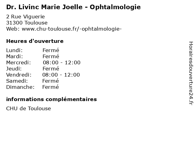 1 Dr. Malecaze Francois - Ophtalmologie (Distance: 0,00 km) 2 Rue Viguerie, 31300 Toulouse docteur, dr., francois, malecaze, medecins, ophtalmologie, sante 2 Dr. Fournie Pierre - Ophtalmologie (Distance: 0,00 km) 2 Rue Viguerie, 31300 Toulouse docteur, dr., fournie, medecins, ophtalmologie, pierre, sante 3 Dr. Darnis Saurel Catherine - Ophtalmologie (Distance: 0,00 km) 2 Rue Viguerie, 31300 Toulouse catherine, darnis, docteur, dr., medecins, ophtalmologie, sante, saurel 4 Dr. Pechmeja Jacmine - Ophtalmologie (Distance: 0,00 km) 2 Rue Viguerie, 31300 Toulouse docteur, dr., jacmine, medecins, ophtalmologie, pechmeja, sante 5 Dr. Lesuer Laurence - Ophtalmologie (Distance: 0,00 km) 2 Rue Viguerie, 31300 Toulouse docteur, dr., laurence, lesuer, medecins, ophtalmologie, sante 6 Dr. Olle Priscille - Ophtalmologie (Distance: 0,00 km) 2 Rue Viguerie, 31300 Toulouse docteur, dr., medecins, olle, ophtalmologie, priscille, sante  |
