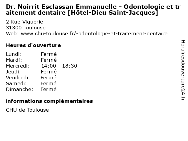 Termes de recherche pour Dr. Noirrit Esclassan Emmanuelle - Odontologie et traitement dentaire [Hôtel-Dieu Saint-Jacques]:dieu, et, saint, dentaire, santé, emmanuelle, traitement, docteur, dr., médecins, odontologie, [hôtel, jacques], esclassan, noirrit |