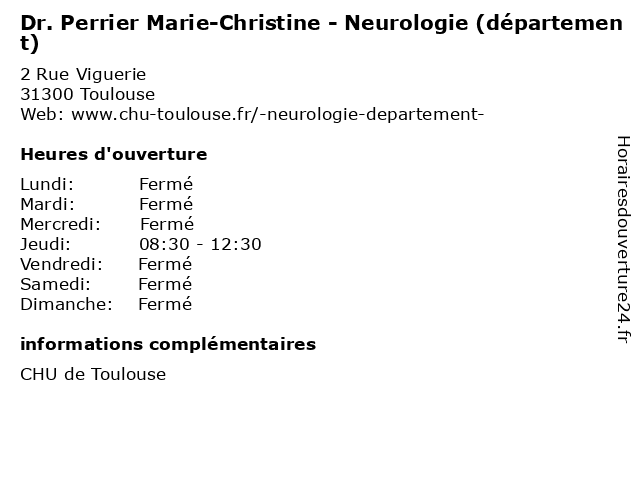 Termes de recherche pour Dr. Perrier Marie-Christine - Neurologie (département):marie, christine, santé, perrier, neurologie, docteur, dr., médecins, département |
