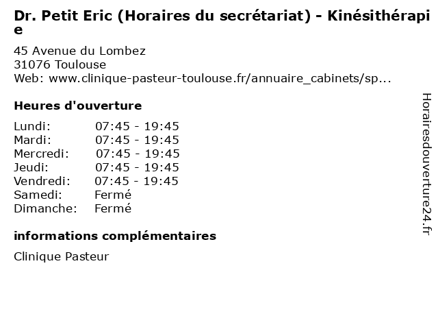 Termes de recherche pour Dr. Petit Eric (Horaires du secrétariat) - Kinésithérapie:du, petit, horaires, eric, santé, kinésithérapie, secretariat, docteur, dr., médecins |