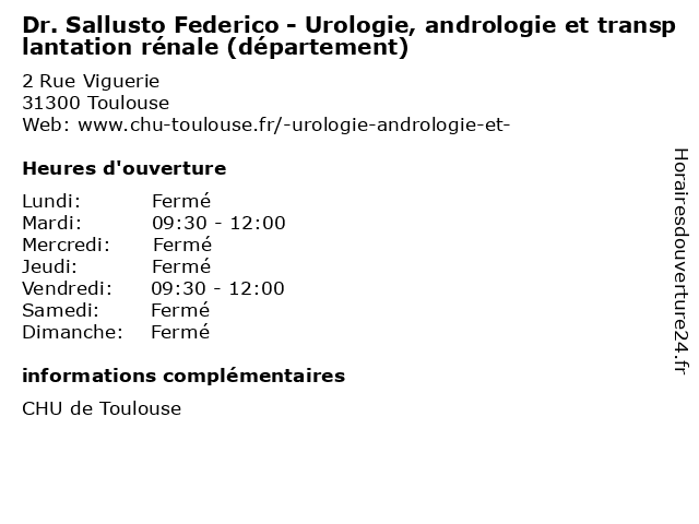 Termes de recherche pour Dr. Sallusto Federico - Urologie, andrologie et transplantation rénale (département):et, santé, docteur, dr., médecins, federico, département, urologie, rénale, transplantation, andrologie, sallusto |