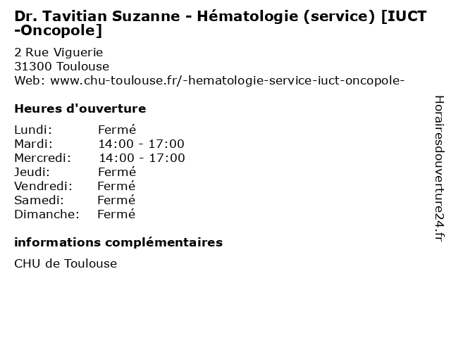 Termes de recherche pour Dr. Tavitian Suzanne - Hématologie (service) [IUCT-Oncopole]:service, santé, suzanne, docteur, dr., médecins, hematologie, [iuct, oncopole], tavitian |