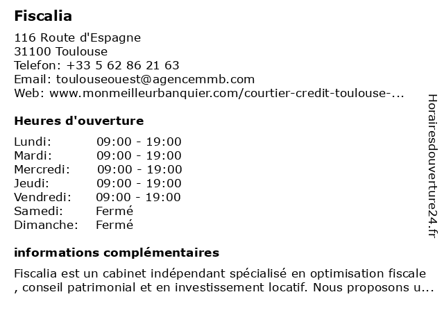 1 Fiscalia - Bureau Toulouse Nord (Distance: 24,68 km) 35 Rue Gambetta, 31330 Grenade agence, bureau, conseils, financement, fiscalia, nord, solutions, toulouse |