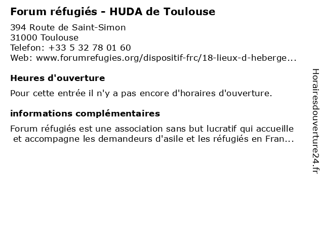 | Appeler Forum réfugiés - HUDA de Toulouse | |