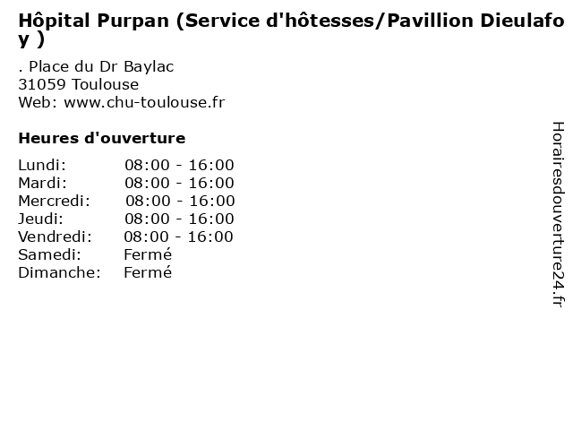 1 Hôpital Purpan (Service d'hôtesses) (Distance: 0,00 km) . Place du Dr Baylac, 31059 Toulouse clinique, d'hôtesses, hôpital, hôpitaux, purpan, santé, service, services 2 Hôpital Purpan (Service d'hôtesses/Pavillion Putois ) (Distance: 0,00 km) . Place du Dr Baylac, 31059 Toulouse clinique, d'hôtesses/pavillion, hôpital, hôpitaux, purpan, putois, santé, service, services 3 Hôpital des Enfants (Distance: 0,42 km) 330 Avenue de Grande-Bretagne, 31059 Toulouse clinique, des, enfants, hôpital, hôpitaux, santé, services 4 Hôpital Villa Ancely (Distance: 0,92 km) 222 Avenue de Casselardit, 31059 Toulouse ancely, clinique, hôpital, hôpitaux, santé, services, villa 5 Hôpital Garonne (Distance: 0,96 km) 224 Avenue de Casselardit, 31059 Toulouse clinique, garonne, hôpital, hôpitaux, santé, services 6 Hôpital La Grave (Distance: 3,13 km) . Place Lange, 31059 Toulouse clinique, grave, hôpital, hôpitaux, la, santé, services |
