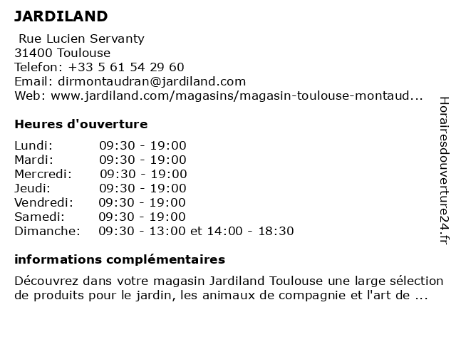 1 Jardiland (Distance: 0,05 km) - Rue Lucien Servanty, 31400 Toulouse détail, enseignes, jardiland, jardinage, magasins, pépinières, vente 2 Jardiland (Distance: 1,06 km) - Route de Labege, 31400 Toulouse aliments pour animaux, animal, animalerie, chat, chien, jardiland, oiseaux, pet shop, souris 3 Jardiland (Distance: 6,94 km) 295 Route d'Espagne, 31100 Toulouse abris de jardin, aménagement du jardin, animaux de compagnie, art de la table, barbecue cuisine d'extérieur, bassin, bougies et senteurs, décoration d'intérieur, entretien et soin des végétaux, equipement du jardinier, jardiland, loisir plein air, luminaires, materiel et bricolage, mobilier de jardin, plantes d'intérieur, pots et contenants, semences et bulbes, végétaux d'extérieur 4 JARDILAND (Distance: 9,11 km) 2 Allée de Port-Vendres, 31240 L'Union aménagement du jardin, animaux de compagnie, art de la table, barbecue cuisine d'extérieur, bassin, bougies et senteurs, décoration d'intérieur, entretien et soin des végétaux, equipement du jardinier, jardiland, loisir plein air, luminaires, mobilier de jardin, plantes d'intérieur, pots et contenants, semences et bulbes, végétaux d'extérieur 5 Les Jardins d'O (Distance: 3,87 km) 35 Rue Stéphane Mallarmé, 31130 Balma balma, créateur, d'o, jardinier, jardins, les, paysagiste 6 Maison de La Presse (Distance: 13,12 km) 2 Place Du Sidobre, 31770 Colomiers cadeaux, carterie, confiserie-boissons-food, de, française des jeux, la, librairie, maison, papeterie, pmu, presse, tabac |