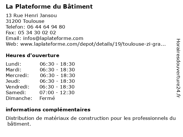 1 La Plateforme du Bâtiment (Distance: 4,77 km) 131 Chemin du Sang de Serp, 31200 Toulouse atelier de découpe, batiment, bâtiment, cafétéria, conseil, du, démonstration, formations, la, plateforme 2 Kiloutou Toulouse (Gramont) - La Plateforme (Distance: 0,34 km) 13 Rue Henri Jansou, 31200 Toulouse abri de chantier, aspirateur de chantier, base vie de chantier, brise-béton, broyeur de branches et de végétaux, brumisateur de chantier, bungalow de chantier, bétonnière, carotteuse, compresseur d'air, débroussailleuse, décolleuse de papier-peint, découpeuse, déshumidificateur d'air, foreuse, gramont, kiloutou, la, location matériel, marteau-piqueur, matériel btp, matériel chantier, matériel tp, matériel travaux publics, module de chantier, nettoyeur à haute pression, outillage, outils, perforateur-burineur, pilonneuse, pistolet à peinture, plaque vibrante, plateforme, ponceuse à parquet, remorque, sableuse, shampouineuse, taille-haie, tondeuse à gazon, toulouse, tronçonneuse à matériaux, échafaudage 4 Segarra Bâtiment (Distance: 2,75 km) 41 Rue Frédéric Chopin, 31200 Toulouse batiment, bâtiment, construction, entreprise, segarra, toulouse 5 BEA Expert Bâtiment (Distance: 3,35 km) 13 Rue de Griffoulet, 31500 Toulouse aménagement, bea, bâtiment, expert, location, logement, maison, électricité 6 Billiato Peinture - Peintre en bâtiment (Distance: 3,64 km) 5 ter impasse de la violette, 31200 L’Union billiato, bâtiment, en, l’union, peintre, peinture |