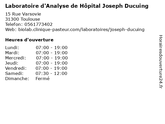 1 Hôpital Joseph Ducuing (Distance: 0,00 km) 15 Rue Varsovie, 31027 Toulouse docteur, ducuing, hôpital, joseph, medecins, sante 2 Hôpital Joseph Ducuing - Horaires de visite / Médecine/Chirurgie (Distance: 0,00 km) 15 Rue Varsovie, 31027 Toulouse bureau, consultation, de, dr, ducuing, horaires, hôpital, joseph, maladie, med, médecin, médecine, médecine/chirurgie, pratique, thérapie, traitement, visite 4 Laboratoire d'Etudes et de Recherches sur l'Economie, les Politiques et les Systèmes Sociaux (Distance: 1,00 km) . Manufacture des Tabacs, 31042 Toulouse d'etudes, de, et, finance et industrie, l'economie, laboratoire, lereps, les, politiques, recherches, reseaux et territoires, sociaux, sur, systèmes 5 Laboratoire Biolab (Distance: 1,02 km) 43-45 Avenue de Lombez, 31076 Toulouse avenir, biolab, laboratoire, services 6 Laboratoire d'Analyse - Clinique Pasteur (Distance: 1,04 km) 45 Avenue du Lombez, 31076 Toulouse analyse, clinique, d'analyse, laboratoire, médical, pasteur |