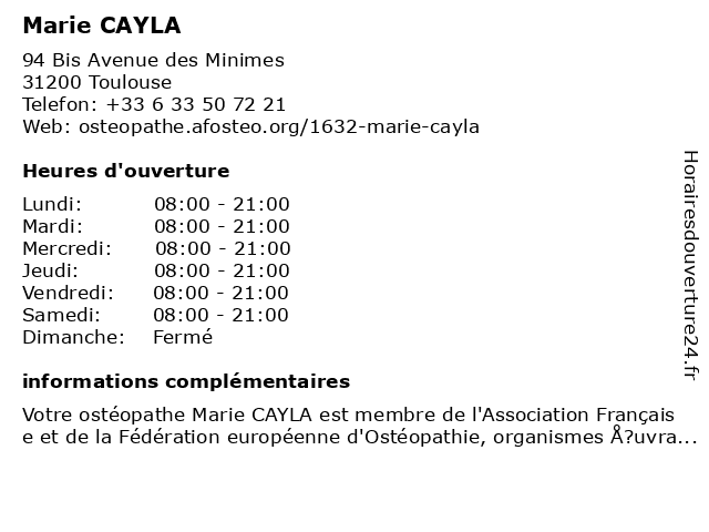 1 Sophie Cayla - Psychologue (Distance: 2,29 km) 5 Rue du Commandant Taillandier, 31500 Toulouse cayla, psy, psychiatre, psychologue, sante, soins, sophie 4 France Cayla - Psychologue (Distance: 38,88 km) 1 Rue de l'École, 81500 Fiac cayla, france, psy, psychiatre, psychologue, sante, soins 5 Château-musée du Cayla - Du 16 février au 30 avril et du 2 novembre au 23 décembre (Distance: 56,96 km) - Le Cayla, 81140 Andillac 16, 23, 30, au, avril, cayla, château, du, décembre, et, exposition, février, musée, novembre, visite 6 Château-musée du Cayla - De 2 mai au 30 juin et du 1er septembre au 31 octobre (Distance: 56,96 km) - Le Cayla, 81140 Andillac 1er, 30, 31, au, cayla, château, de, du, et, exposition, juin, mai, musée, octobre, septembre, visite |