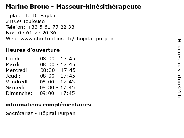 1 Marine Chartier - Masseur-kinésithérapeute (Distance: 0,00 km) - place du Dr Baylac, 31059 Toulouse chartier, consultation, docteur, dr, kinésithérapeute, marine, masseur, med, médecin, traitement 2 Dr Eischen Marine - Rhumatologie générale (Distance: 0,04 km) - Place du Docteur Baylac, 31059 Toulouse docteur, dr, eischen, générale, hôpital, marine, médecine, rhumatologie 3 Dr Dutertre Marine - Maladies infectieuses, tropicales – VIH (Distance: 0,04 km) - Place du Docteur Baylac, 31059 Toulouse docteur, dr, dutertre, hôpital, infectieuses, maladies, marine, médecine, tropicales, vih 4 Marine Floriant - Masseur-kinésithérapeute - secrétariat (Distance: 2,88 km) 10 Rue des Arcs Saint-Cyprien, 31300 Toulouse docteur, floriant, kinésithérapeute, marine, masseur, médecin, médecine, secrétariat 5 Dr. Dutertre Marine - Maladies infectieuses et tropicales (Distance: 3,30 km) 2 Rue Viguerie, 31300 Toulouse docteur, dr., dutertre, et, infectieuses, maladies, marine, medecins, sante, tropicales 6 Dr. Eischen Marine - Rhumatologie (Centre de rhumatologie du CHU de Toulouse) (Distance: 3,30 km) 2 Rue Viguerie, 31300 Toulouse centre, chu, de, docteur, dr., du, eischen, marine, medecins, rhumatologie, sante, toulouse |