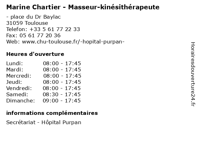 1 Marine Broue - Masseur-kinésithérapeute (Distance: 0,00 km) - place du Dr Baylac, 31059 Toulouse broue, consultation, docteur, dr, kinésithérapeute, marine, masseur, med, médecin, traitement 2 Dr Eischen Marine - Rhumatologie générale (Distance: 0,04 km) - Place du Docteur Baylac, 31059 Toulouse docteur, dr, eischen, générale, hôpital, marine, médecine, rhumatologie 3 Dr Dutertre Marine - Maladies infectieuses, tropicales – VIH (Distance: 0,04 km) - Place du Docteur Baylac, 31059 Toulouse docteur, dr, dutertre, hôpital, infectieuses, maladies, marine, médecine, tropicales, vih 4 Marine Floriant - Masseur-kinésithérapeute - secrétariat (Distance: 2,88 km) 10 Rue des Arcs Saint-Cyprien, 31300 Toulouse docteur, floriant, kinésithérapeute, marine, masseur, médecin, médecine, secrétariat 5 Dr. Dutertre Marine - Maladies infectieuses et tropicales (Distance: 3,30 km) 2 Rue Viguerie, 31300 Toulouse docteur, dr., dutertre, et, infectieuses, maladies, marine, medecins, sante, tropicales 6 Dr. Eischen Marine - Rhumatologie (Centre de rhumatologie du CHU de Toulouse) (Distance: 3,30 km) 2 Rue Viguerie, 31300 Toulouse centre, chu, de, docteur, dr., du, eischen, marine, medecins, rhumatologie, sante, toulouse |
