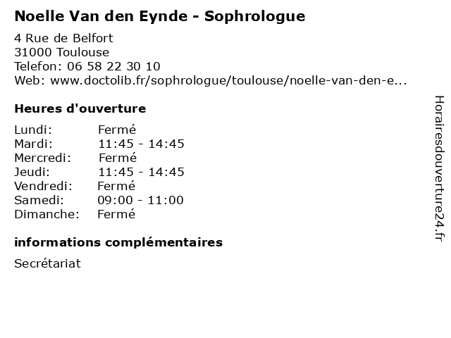 1 Raphaële Havard - Sophrologue (Distance: 0,20 km) 44 Rue de Bayard, 31000 Toulouse havard, medecin, raphaële, sante, sophro, sophrologue 2 Anabel Stambollian - Sophrologue (Distance: 0,34 km) 50 Rue du Général Jean Compans, 31500 Toulouse anabel, sante, soins, sophrologie, sophrologue, stambollian 3 Heidi Tsai - Sophrologue (Distance: 0,44 km) 10 Rue de l'Industrie, 31000 Toulouse heidi, medecin, sante, sophro, sophrologue, tsai 4 Valérie Drouet - Sophrologue (Distance: 0,48 km) 38 Rue Riquet, 31000 Toulouse drouet, medecin, sante, sophro, sophrologue, valérie 5 Dr Florence Van Gaver - Dermatologue et vénérologue (Distance: 0,54 km) 7 Place du Président Thomas Wilson, 31000 Toulouse consultation, dermatologie, dermatologue, docteur, dr, et, florence, gaver, monna, médecins, rendez, santé, sur, van, vous, vénérologue 6 Dr Noelle Simon - Chirurgien-dentiste (Distance: 0,54 km) 24 Boulevard Bonrepos, 31000 Toulouse chirurgien, consultation, dentiste, docteur, dr, med, noelle, secrétariat, simon |