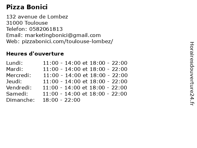 2 Pizza Bonici (Distance: 6,60 km) 4 Place du Lioran, 31770 Colomiers bonici, pizza, pizzeria, restaurant 3 4 Pizza Bonici (Distance: 7,21 km) 442 bis avenue de Fronton, 31200 Aucamville bonici, pizza, pizzeria, restaurant 5 Pizza Bonici (Distance: 9,79 km) 83 avenue des Pyrénées, 31830 Plaisance du Touch bonici, pizza, pizzeria, restaurant 6 Pizza Bonici (Distance: 11,78 km) 94 avenue du Lauragais, 31320 Castanet Tolosan bonici, milla, pizza, restaurants |