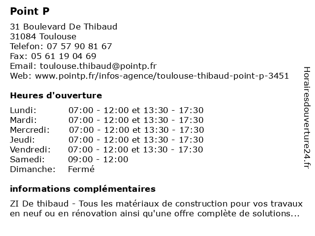 1 Point P (Distance: 0,00 km) 31 Boulevard De Thibaud, 31100 Toulouse aménagement, equipement, loisirs, point 2 Point P (Distance: 8,49 km) 31 Boulevard De Joffrery, 31600 Muret carrelage, magasin, materiaux, parquet, point 3 Point P (Distance: 9,83 km) 241 Route D'Albi, 31200 Toulouse carrelage, magasin, materiaux, parquet, point 4 Point P (Distance: 9,99 km) . Rue Ampere, 31830 Plaisance-du-Touch aménagement, equipement, loisirs, point 5 6 Point P (Distance: 17,85 km) 1 Route de Bessières, 31140 Pechbonnieu aménagement, construction, matériaux, outillages, point, équipement |