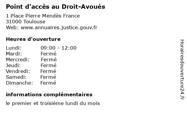1 Point d'accès au Droit-Horaires permanence « médiation familiale (Distance: 0,00 km) 1 Place Pierre Mendès France, 31000 Toulouse au, d'accès, droit, familiale, horaires, médiation, permanence, point, public, services 2 Point d'accès au Droit-Horaires permanence « droits des jeunes (Distance: 0,00 km) 1 Place Pierre Mendès France, 31000 Toulouse au, d'accès, des, droit, droits, horaires, jeunes, permanence, point, public, services 3 Point d'accès au Droit-Avocats (Distance: 0,00 km) 1 Place Pierre Mendès France, 31000 Toulouse au, avocats, d'accès, droit, point, public, services 4 Point d'accès au Droit-Notaries (Distance: 0,00 km) 1 Place Pierre Mendès France, 31000 Toulouse au, d'accès, droit, notaries, point, public, services 5 Point d'accès au Droit-Horaires permanence « aide aux victimes (Distance: 0,00 km) 1 Place Pierre Mendès France, 31000 Toulouse aide, au, aux, d'accès, droit, horaires, permanence, point, public, services, victimes 6 Point d'accès au Droit (Distance: 1,54 km) 2 Allées Jules Guesde, 31000 Toulouse au, d'accès, droit, point, public, services |