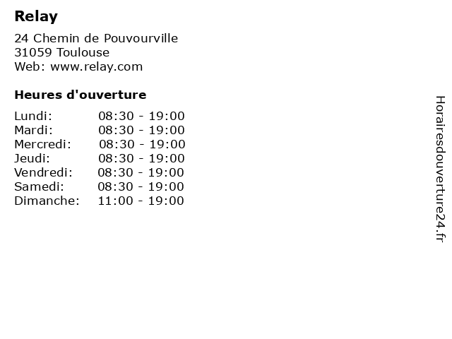 1 Relay (Distance: 0,64 km) 1 Avenue Jean Poulhès, 31403 Toulouse beverages, food, gifts, paper, printing, relay, service products, telephone 2 Relay (Distance: 2,19 km) 1 Av. Irène Joliot-Curie, 31100 Toulouse beverages, food, gifts, paper, printing, relay, service products, telephone 3 Relay (Distance: 6,45 km) 64 Boulevard Pierre Semard, 31079 Toulouse café, journaux, magasines, presse, relay, sandwiches, viennoiseries 4 Relay (Distance: 6,45 km) 64 Boulevard Pierre Semard, 35203 Toulouse café, journaux, magasines, presse, relay, sandwiches, viennoiseries 5 Relay (Distance: 7,58 km) n/a Place dr Baylac, 31059 Toulouse beverages, food, gifts, paper, printing, relay, service products, telephone 6 Relay (Distance: 7,60 km) 330 Avenue de Grande Bretagne, 31059 Toulouse beverages, food, gifts, paper, printing, relay, service products, telephone |