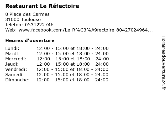 | Dimanche | 12:00-15:00 et 18:00-24:00 |