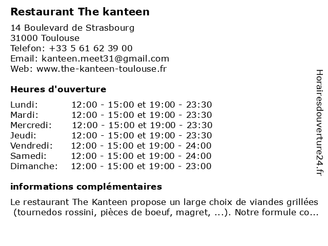 | Dimanche | 12:00-15:00 et 19:00-23:00 |