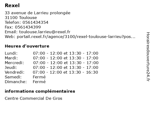 1 Rexel (Distance: 0,01 km) 33 Avenue de Larrieu Prolongée, 31000 Toulouse bricolage, loisirs, rexel, services 3 Rexel (Distance: 7,95 km) 131 Chemin du Sang de Serp, 31200 Toulouse bricolage, loisirs, rexel, services 6 Rexel (Distance: 10,24 km) . De la Menude, 31830 Plaisance du Touch bricolage, loisirs, rexel, services |