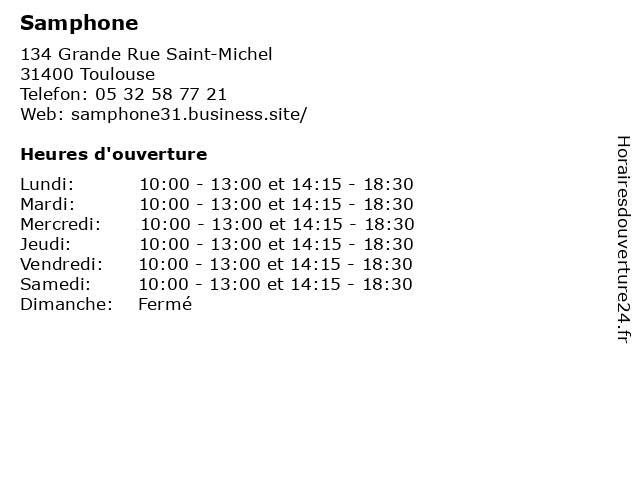 | Samedi | 10:00-13:00 et 14:15-18:30 |