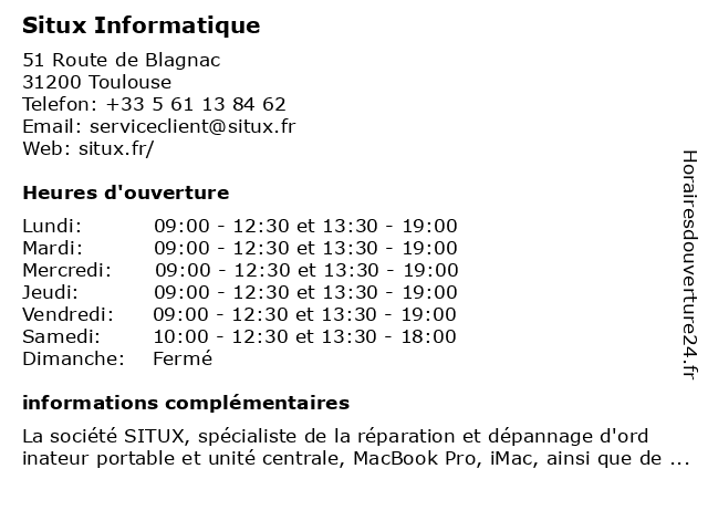 | Samedi | 10:00-12:30 et 13:30-18:00 |