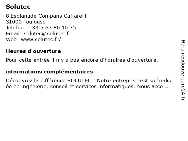 1 Solutec Conseils (Distance: 4,67 km) 12 Rue Louis Renault, 31130 Balma audit, cabinet, conseil, conseils, expertise comptable, fiscalité, juridique, paie, rh, social, solutec |