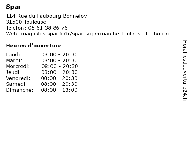 | 1 Spar (Distance: 0,42 km) 160 Boulevard Bonnefoy, 31000 Toulouse alimentaire, alimentation, courses, distributeur, spar, supermarché, supérette, épicerie 2 Spar (Distance: 4,51 km) 71 Route de Fronton, 31140 Aucamville alimentaire, alimentation, courses, distributeur, spar, supermarché, supérette, épicerie 3 SPAR (Distance: 4,67 km) 34 CHEMIN MARECHAL CLABEL, 31000 Toulouse alimentation, légumes et de fruits, spar, épicerie 4 Spar (Distance: 4,99 km) 9 Boulevard Jean Rivet, 31700 Blagnac alimentaire, alimentation, courses, distributeur, spar, supermarché, supérette, épicerie 5 Spar (Distance: 5,29 km) 13 rue du Général Barès, 31400 Toulouse alimentation, fruits, légumes, spar, supérette, épicerie 6 SPAR (Distance: 7,52 km) 273 AVENUE DE LARDENNE, 31170 Tournefeuille alimentation, légumes et de fruits, spar, épicerie |