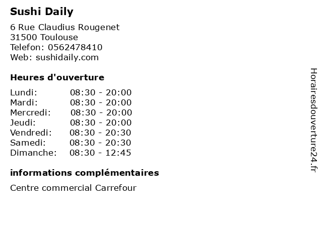 1 Sushi Daily (Distance: 4,44 km) 3 Esplanade Compans Cafarelli, 31000 Toulouse daily, emporter, japonais, makis, restaurant, sushi, vente 2 Sushi Daily (Distance: 5,58 km) 700 La Pyrénéenne, 31670 Labège daily, emporter, japonais, makis, restaurant, sushi, vente 3 Sushi Daily (Distance: 6,98 km) 1 rue Louis Braille, 31520 Ramonville-Saint-Agne daily, emporter, japonais, makis, restaurant, sushi, vente 4 Sushi Daily (Distance: 7,50 km) 36 Route de Bayonne, 31300 Toulouse daily, emporter, japonais, makis, restaurant, sushi, vente 5 Sushi Daily (Distance: 9,30 km) 30 Chemin Ferro-Lèbres, 31100 Toulouse daily, emporter, japonais, makis, restaurant, sushi, vente 6 Sushi Daily (Distance: 10,23 km) . boulevard de l'Europe, 31120 Portet-sur-Garonne daily, emporter, japonais, makis, restaurant, sushi, vente |