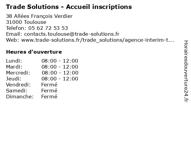 1 Trade Solutions - Accueil inscriptions (Distance: 9,48 km) 27 Allées du Roussillon, 31770 Colomiers accueil, agence, inscriptions, interim, solutions, trade 2 Trade Solutions - Accueil inscriptions (Distance: 18,47 km) 143 Avenue Jacques Douzans, 31600 Muret accueil, agence, inscriptions, interim, solutions, trade 3 Trade Solutions (Distance: 0,01 km) 38 Allées François Verdier, 31000 Toulouse agence, d'ouverture, horaires, interim, solutions, trade 4 Api - Job solutions (Distance: 1,90 km) 8 Esplanade Compans Caffarelli, 31100 Toulouse agence, aide, api, emploi, intérim, job, offres, partiel, solutions, temporaire 5 RH Solutions (Distance: 6,06 km) 12 Avenue de l'Europe, 31520 Ramonville Saint Agne rh, services, services aux entreprises, solutions 6 Neghome Solutions (Distance: 6,93 km) 17 avenue Didier Daurat, 31700 Blagnac conseils, courtier, crédit, investissement, neghome, prêt, solutions |
